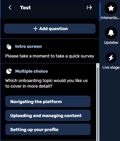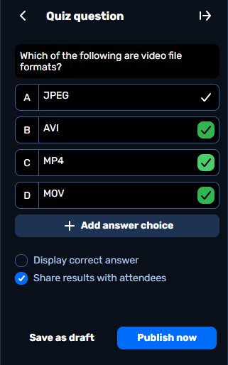 From the Interactions tab in the Chat and collaboration widget, you can create polls, quizzes, rating scales, surveys, word clouds, announcements, and more – all designed to keep students engaged and participating in real time. Once created, interactions can be published (made visible to students) right away, saved as drafts, or scheduled to appear at a later time. *NOTE: The Whiteboard is also a tool that drives engagement, but it is accessed from the Quick Share menu.