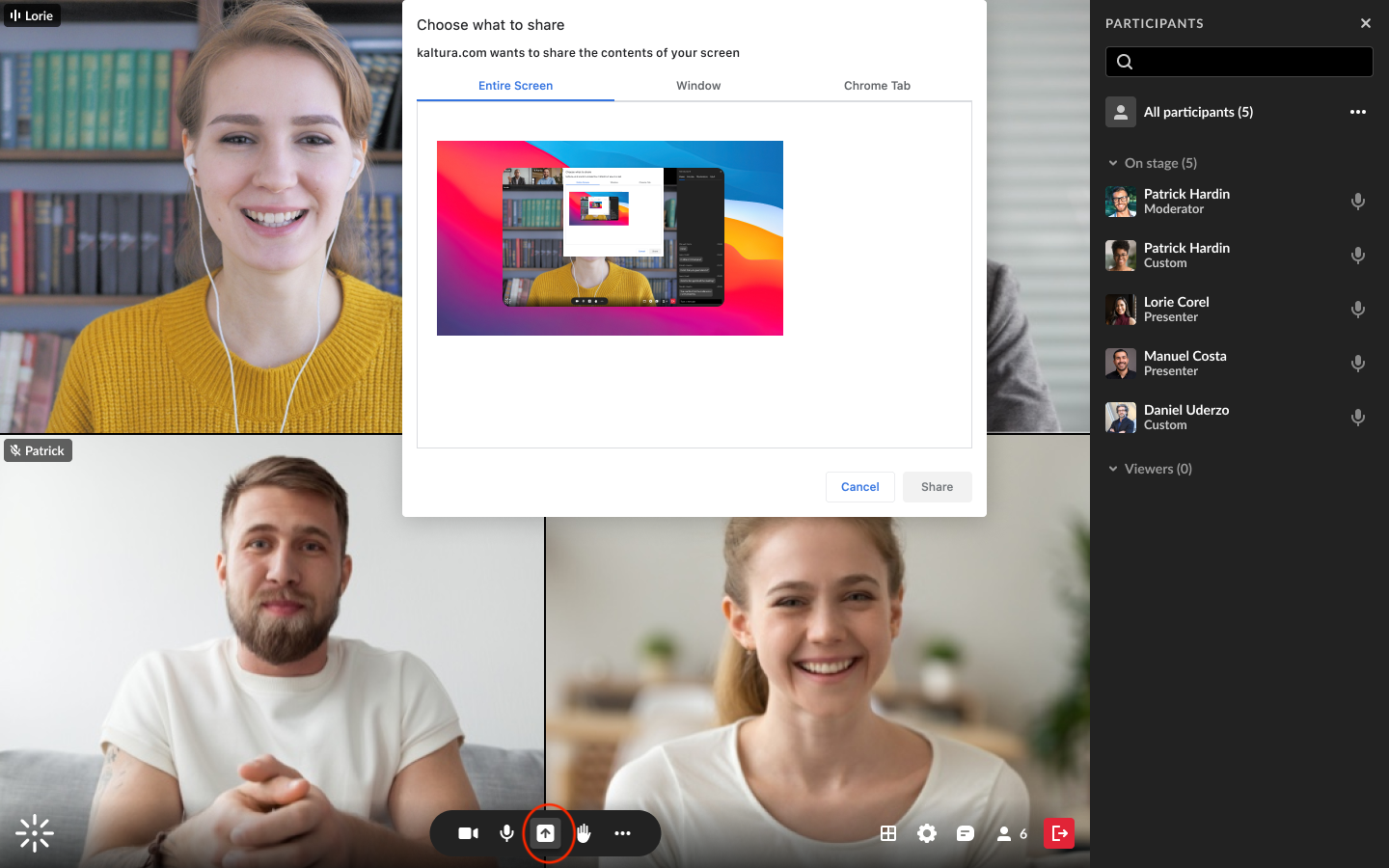 Sharing screens is a default permission for hosts and moderators, and can also be custom enabled for participants on an individual basis. With this feature, you can choose to share your entire screen, a select window or select tab, whether you are a viewer in the room or already a presenter on stage.